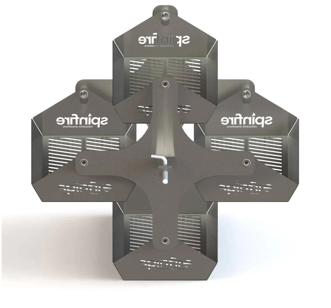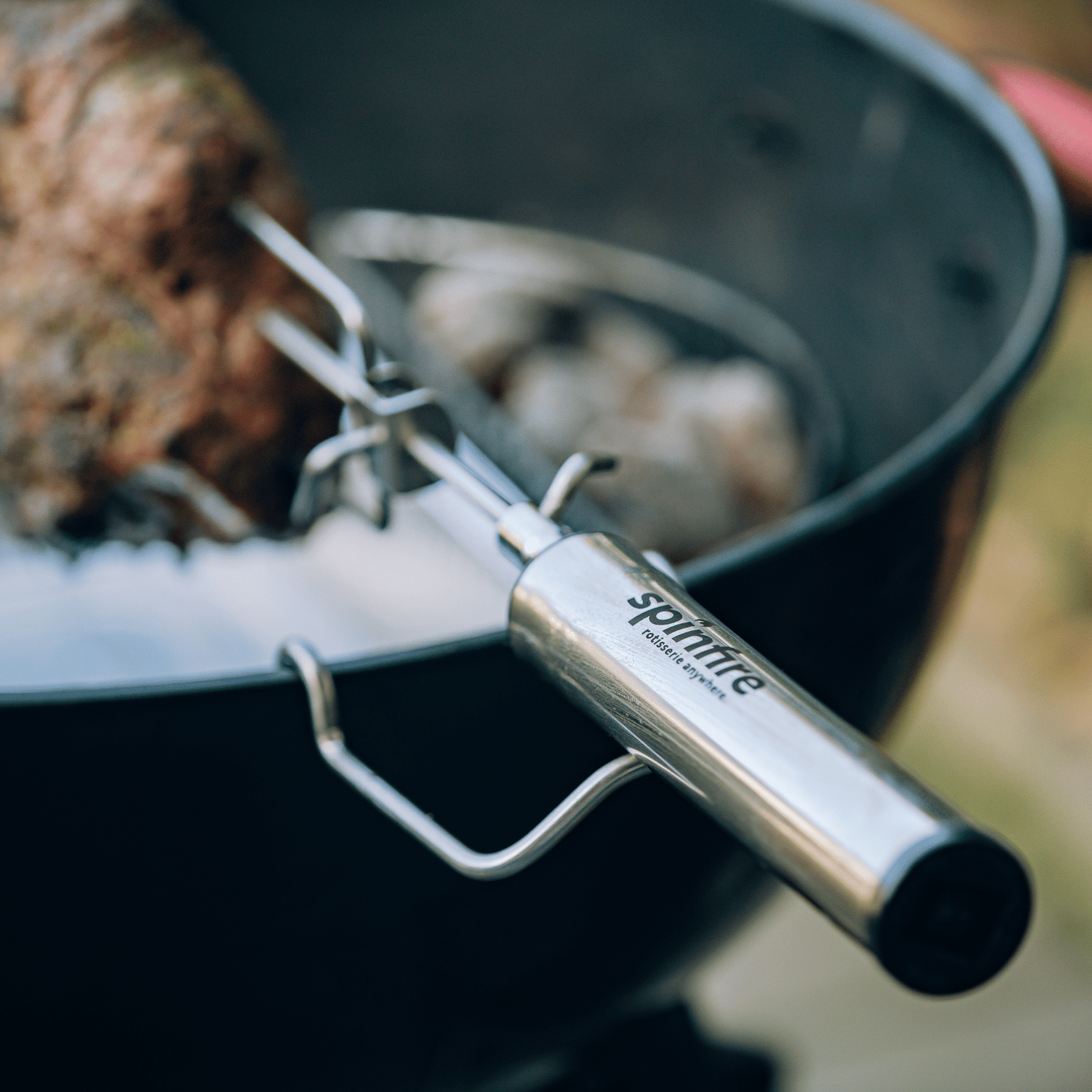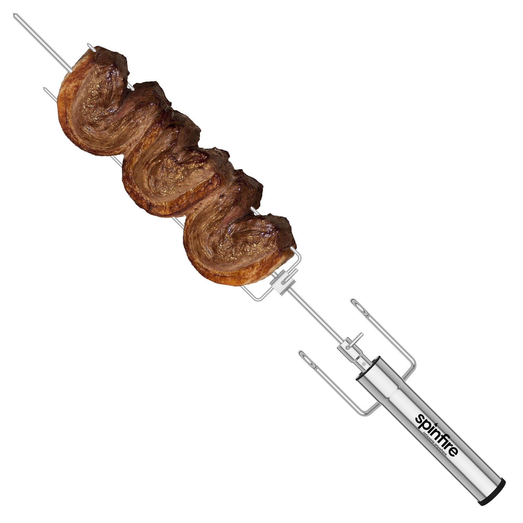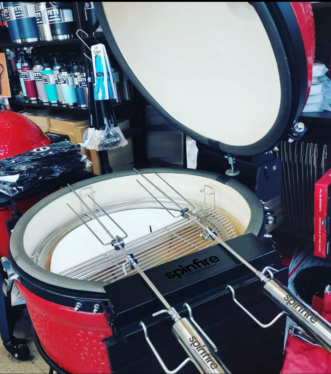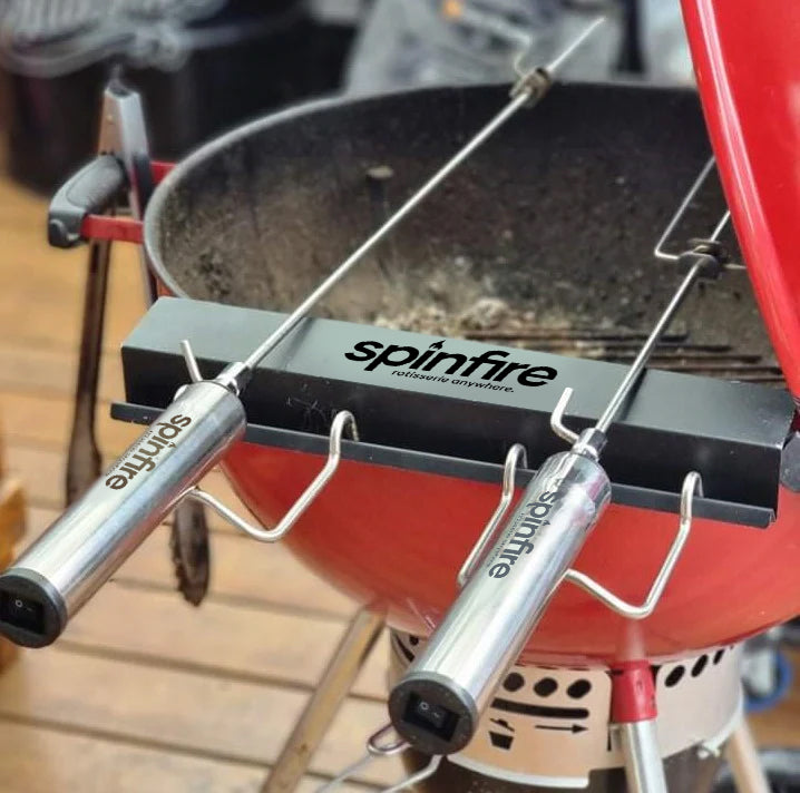The Spinfire rotisserie is the best new addition to your existing barbecue. Portable & handy for barbecuing on the go, the Spinfire will take you from your home BBQ to your camping grill. The Spinfire can hold up to 5kg of Meat and runs up to 50 hours* with Alkaline batteries, giving you the confidence to rotisserie cook any place, any time. The Spinfire can be adapted to use on many different grills, simply using the extension accessory to adapt its length. Suitable for kettles & drums including Weber, Oklahoma Joe Bronco, Big Green Eggs & Pit Barrels plus many, many more.